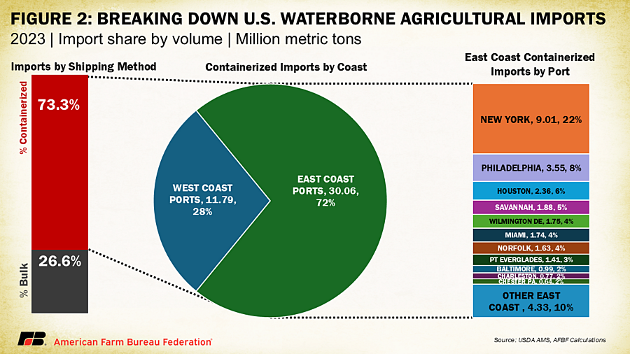 On the import side, containerized products play a much more significant role, representing 73% of all waterborne agricultural imports. The East Coast is crucial for these imports, handling 72% (30 million metric tons) of containerized agricultural imports. The top ports for these imports include New York, Philadelphia and Houston, with 11 ports accounting for nearly 90% of all containerized agricultural imports. In total, 53% of U.S. waterborne agricultural imports, by volume, could be affected by an ILA strike, leading to a potential economic impact of over $1.1 billion per week. Collectively, the value of containerized agricultural products passing through ILA-controlled ports, including both imports and exports, exceeds $1.4 billion per week.