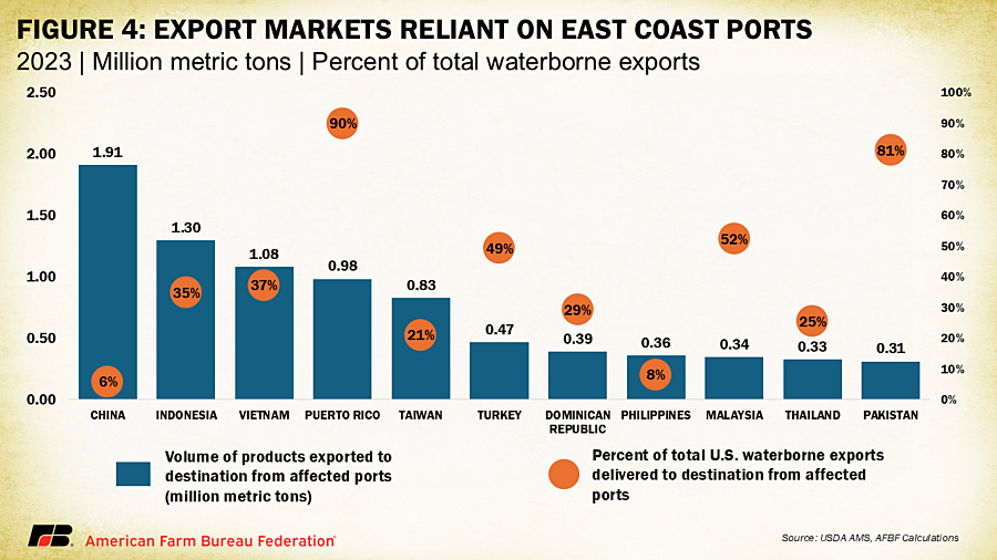 Should the threatened strike occur, the most significant disruptions would be felt in containerized agricultural exports, which compose just over 30% of U.S. waterborne agricultural exports by volume. The remaining 70% are raw, unprocessed commodities like grains, oilseeds, pulses, rice and animal feed, which are typically transported on specialized bulk carriers that are loaded and unloaded at dedicated facilities that often operate with non-ILA unions or independent workforces.