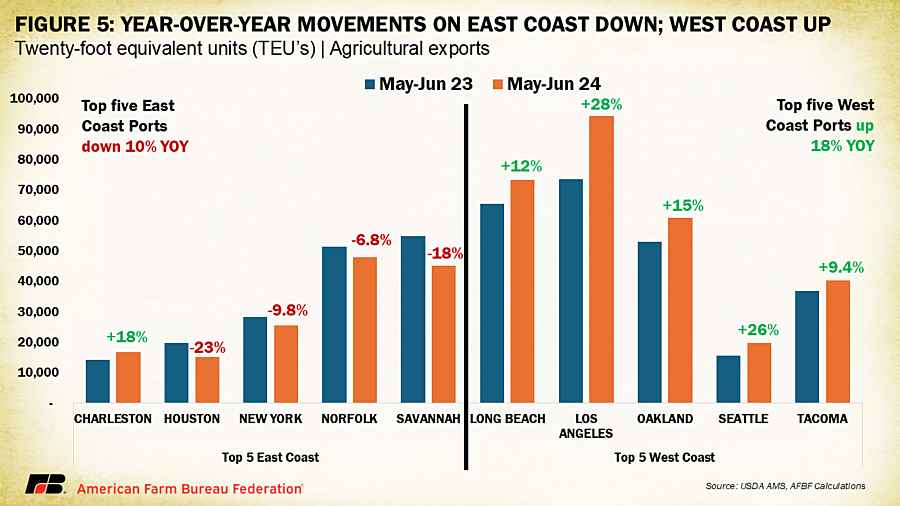 This shift is reflected in the changing container activity along both coasts as tracked by the USDA. Between May and June 2023 and the same period in 2024, agricultural product container volumes (measured in 20-foot equivalents) dropped at four of the top five East Coast ports but rose significantly at the top five West Coast ports handling agricultural trade. For example, agricultural exports from Los Angeles increased by 28%, Seattle by 26% and Oakland by 15%.