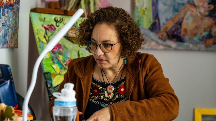 Mindiola uses scissors to cut out her colored strips, tiny images and hidden messages. When customers commission portraits from her, she likes to have a list of things and images that are meaningful for them. That way she can tuck them around the strips of paper.