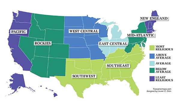 - Least Religious States: Low church attendance, higher percentages of individuals identifying as unaffiliated, acceptance of various secular viewpoints.
